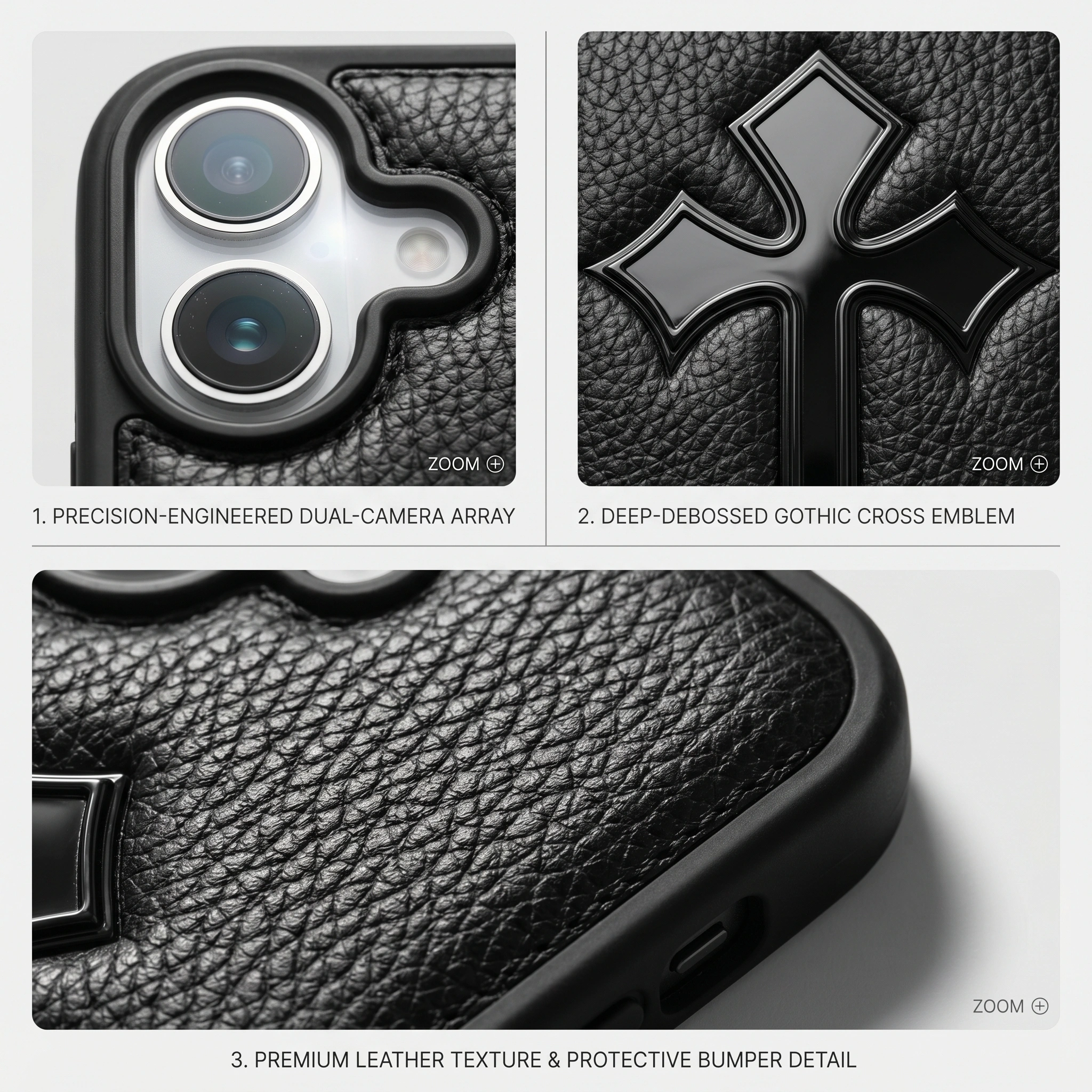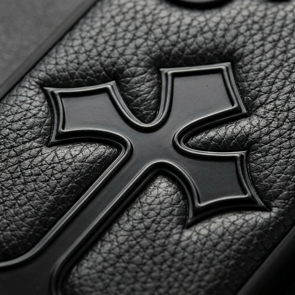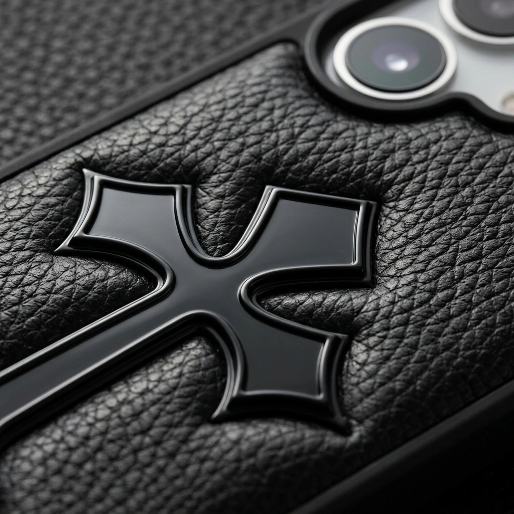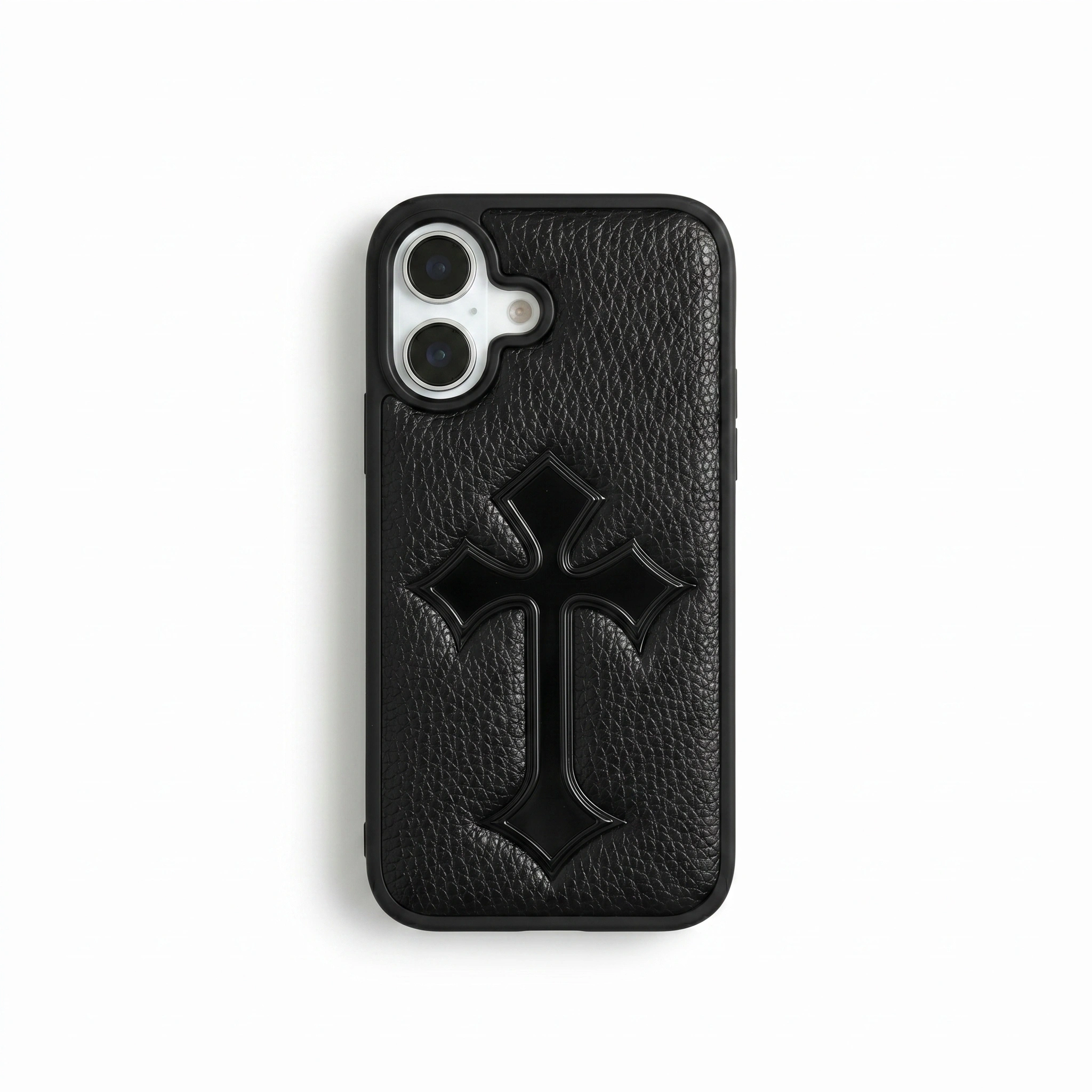 Street-Ready Noir. A premium black pebbled leather case featuring a high-gloss debossed gothic cross. Designed for a clean, stealthy aesthetic with maximum impact protection and a non-slip grip.