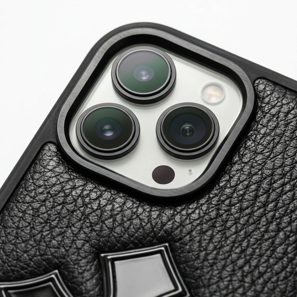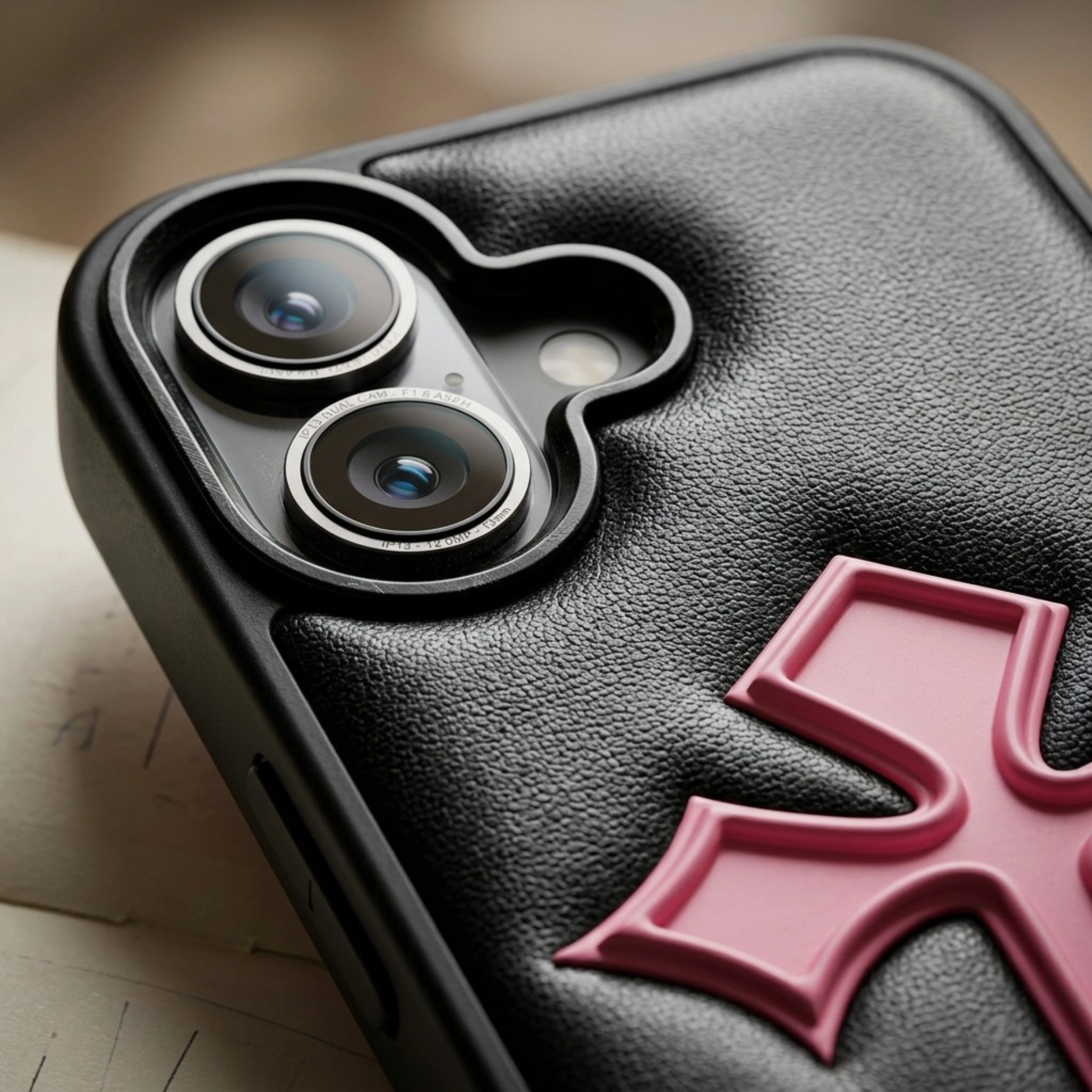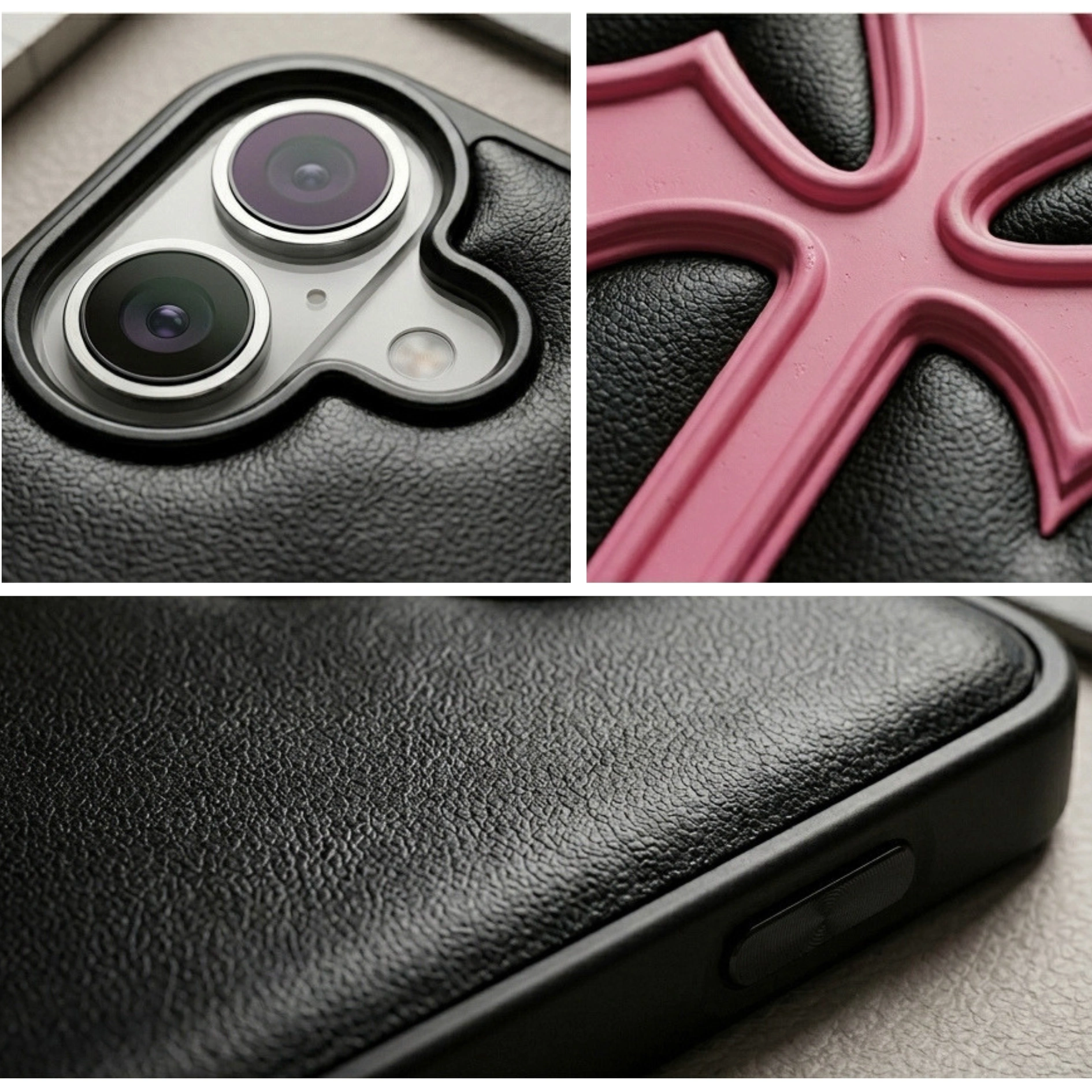 Street-Ready Noir. A premium black pebbled leather case featuring a high-gloss debossed gothic cross. Designed for a clean, stealthy aesthetic with maximum impact protection and a non-slip grip.