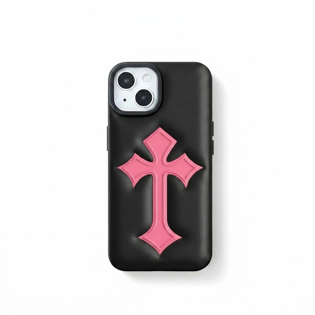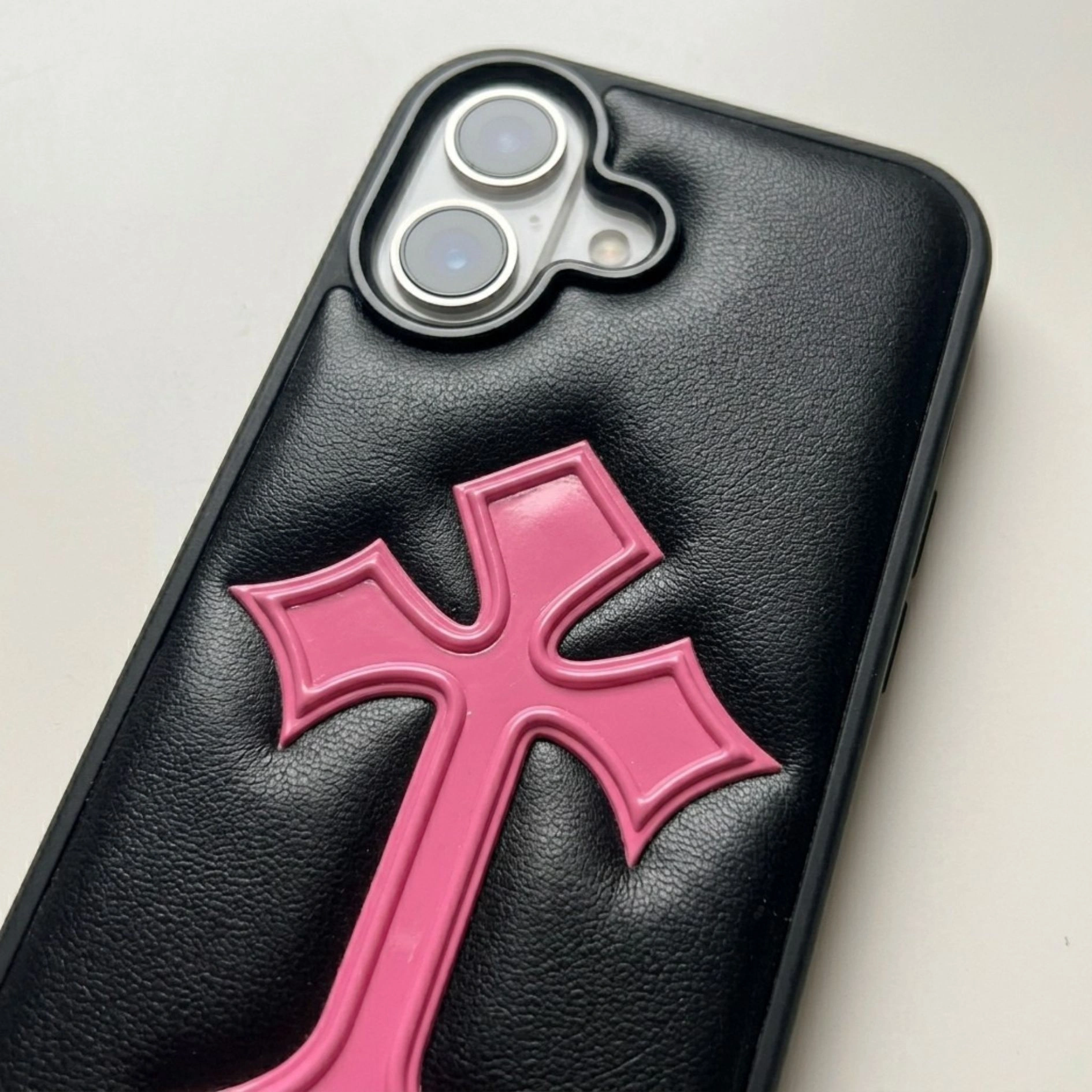 Cyber-Goth Energy. Combines matte black textured leather with a vibrant neon pink 3D cross. The ultimate Y2K-inspired accessory that mixes high-fashion edge with a bold pop of color.