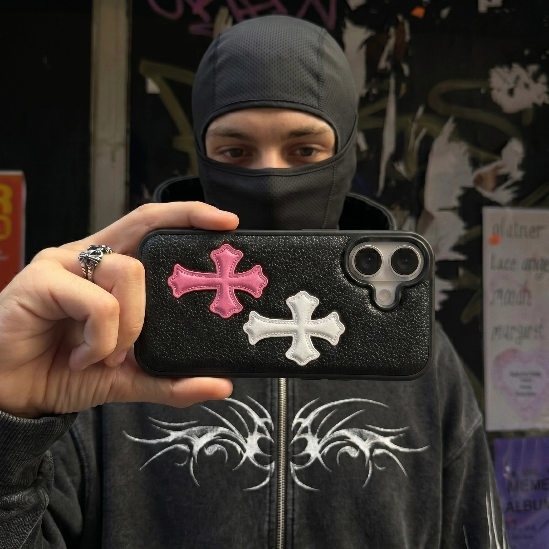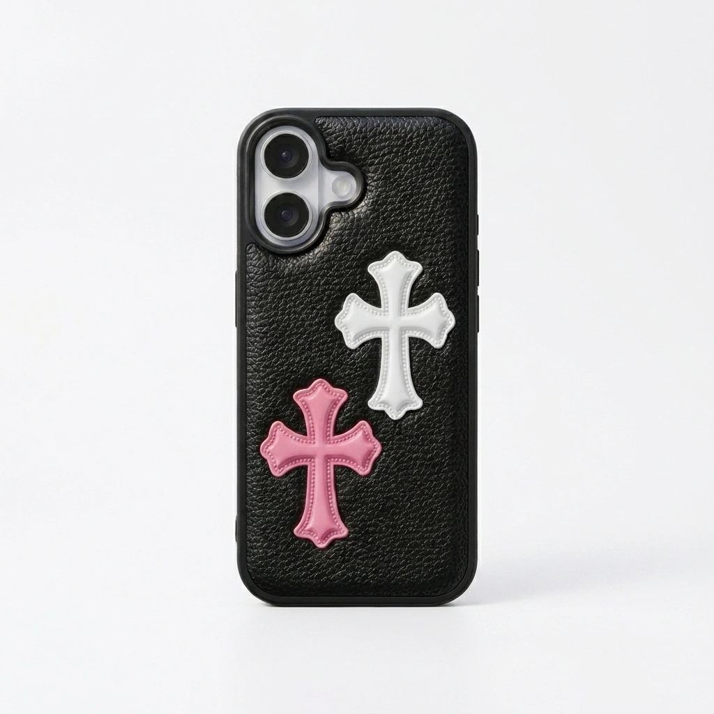Turn heads with the Double Cross Pink & White Case, where dark-wear edge meets high-energy pop. This edition features a striking contrast of crisp white and vibrant pink against a deep black leather grain, creating a visual built for the spotlight and designed for the daring.