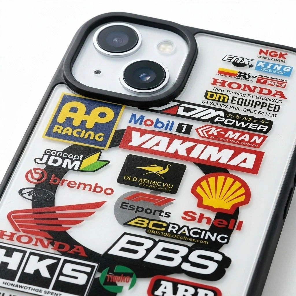 HD Sticker Bomb Print – Features legendary automotive and racing logos like Honda, Brembo, HKS, BBS, and Mobil 1 in a vibrant, scratch-resistant finish.